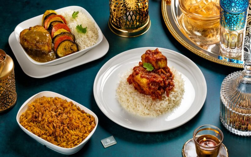 Premium Economy and Business Class passengers can opt for traditional chicken mashwi el jeder, with a spiced sauce, chickpea hashwa and ghee rice tossed with potatoes, or a fish matfy in a spiced tomato sauce and indulgent butter rice. Desserts will include a fragrant pistachio and hibiscus namoura with raspberry curd, or a luscious vanilla and rose mousse cake.
